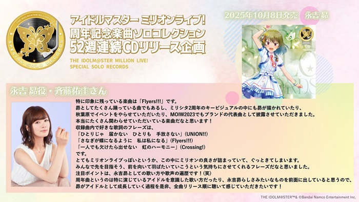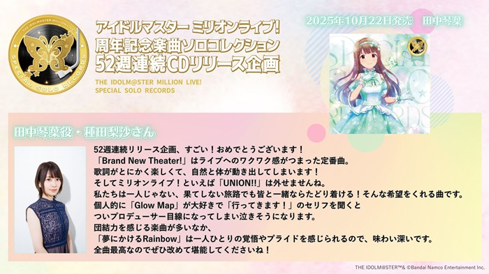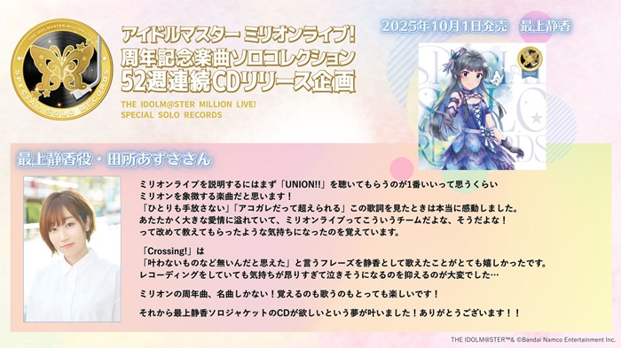 2025年7月23日(水)を皮切りに、2025年10月は「THE IDOLM@STER MILLION LIVE! SPECIAL SOLO RECORDS 最上静香」、「THE IDOLM@STER MILLION LIVE! SPECIAL SOLO RECORDS 永吉 昴」、「THE IDOLM@STER MILLION LIVE! SPECIAL SOLO RECORDS ジュリア」、「THE IDOLM@STER MILLION LIVE! SPECIAL SOLO RECORDS 田中琴葉」、「THE IDOLM@STER MILLION LIVE! SPECIAL SOLO RECORDS我那覇 響」がリリースされました。