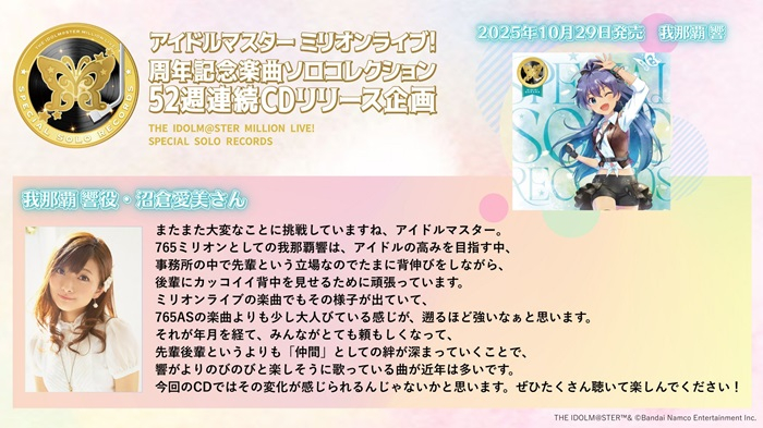 『アイドルマスター ミリオンライブ!』全52人のアイドルそれぞれが歌唱するソロコレクションCDを、“52週連続”で“52枚”リリースする企画「SPECIAL SOLO RECORDS」が進行中!