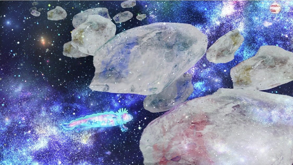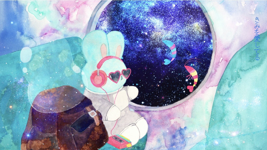 わたしのお気に入りは、間奏部分、宇宙空間の引きの絵になり、ウーパールーパーが隕石の間を泳いでいるシーン。初めて見たとき、美しすぎて涙がでました。額縁に飾りたい。そして、楽曲に合わせてうさぎも口笛を吹いているシーン。ヘッドフォンをつけているのですが、あなたの耳はそこだったのね!と突っ込みたくなるシュールさもずみさんの遊び心が溢れていて最高です。