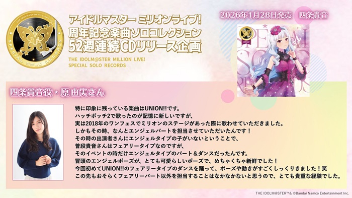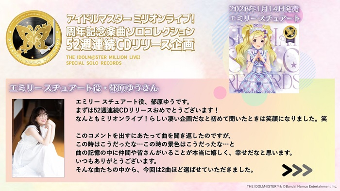 2025年7月23日(水)を皮切りに、2026年1月は「THE IDOLM@STER MILLION LIVE! SPECIAL SOLO RECORDS 高山紗代子」、「THE IDOLM@STER MILLION LIVE! SPECIAL SOLO RECORDS エミリー スチュアート」、「THE IDOLM@STER MILLION LIVE! SPECIAL SOLO RECORDS 北沢志保」、「THE IDOLM@STER MILLION LIVE! SPECIAL SOLO RECORDS 四条貴音」がリリースされました。