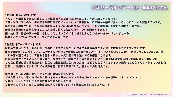 エミリーが全員曲を最初に皆さんにお披露目する役目に選ばれたこと、非常に嬉しかったです。