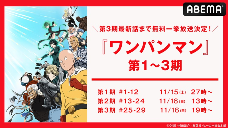 「ABEMA」にて『ワンパンマン』第1期・第2期全話と第3期最新話までの振り返り無料一挙放送決定!