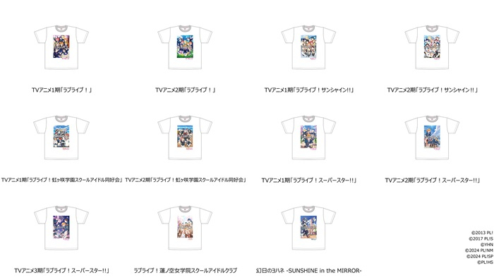 作品のアニメ放送当時の番組宣伝ポスター柄など、100 種類以上のデザインの中から好きなものを選び、その場で T シャツにプリントするサービスです。サンライズワールド「ラブライブ!シリーズ」フェアにあわせて作品のキービジュアルなど 11 種のデザインが追加されます。
