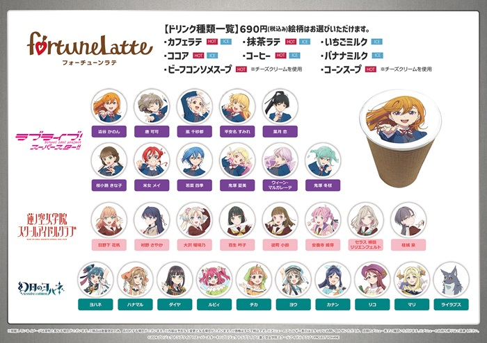 各「バンダイナムコ Cross Store」内のカフェでは、サンライズブランド作品のイラストをプリントした、ラテアートドリンク(税込 690 円)を販売します。(サンライズワールド「ラブライブ!シリーズ」フェアにあわせて、各シリーズのメンバーがプリントされた新柄全 60 種をフェア期間限定で販売) また、ラテ 1 杯購入毎に、描き下ろしキービジュアルメンバーが、それぞれデザインされた購入特典のコースター1 枚をプレゼントします。(ランダム配布)