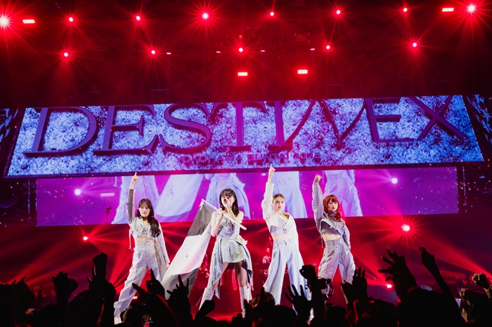 オープニングムービーから4人の気合は伝わってきた。廃墟に立つ4人、そして急ブレーキをかける暴走トラック。その荷台には今回のライブタイトル“DESTINEX”の文字。同曲のMVを思い起こさせる映像だ。普段、ライブハウスで泥臭い公演を行うことが多いグループなので、こういったド派手な映像演出はいい意味で刺激が強い。一気に興奮が高まるのを感じた。しかも、オープニングナンバー「DESTINEX」のイントロが鳴り響く中、4人のメンバーが登場したのは、丁字になっている花道の先にあるセンターステージ。意表をついた登場にゾワッと興奮の鳥肌が立つ。